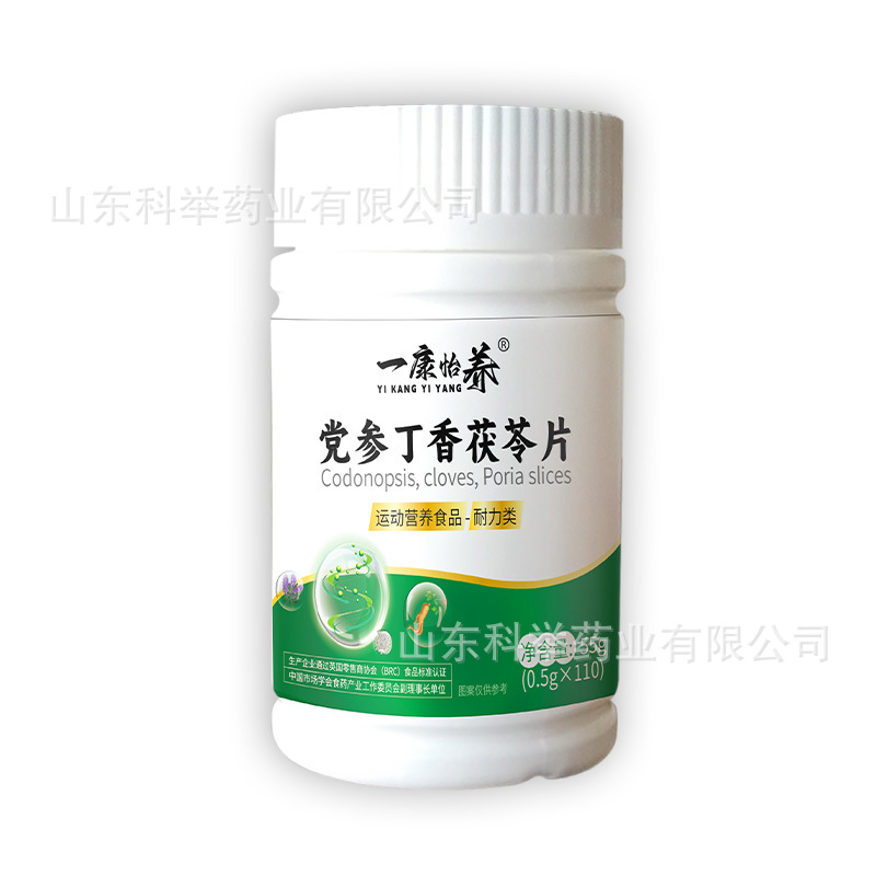 【產品名稱】:一康怡養黨參丁香茯苓片【品牌】:一康怡養【類型】:運動營養食品-耐力類【主要原料】:黨參粉、橘皮粉、砂仁粉、茯苓粉、甘草粉、 猴頭菇粉、丁香粉、沙棘粉、維生素B1、維生素B2【保質期】:24個月【凈含量】:0.5g*110【適用對象】:適用于中長跑、慢跑、快走、自行車、游泳、 劃船、有氧健身操、舞蹈、戶外運