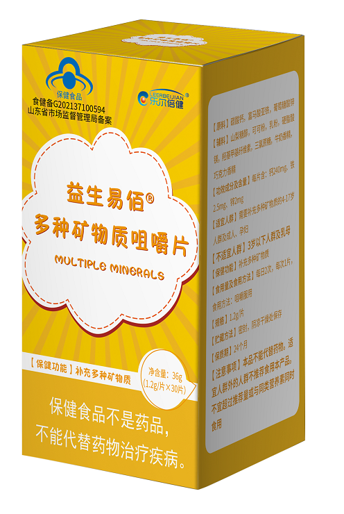 【保健功能】補(bǔ)充多種礦物質(zhì)【批準(zhǔn)文號】食健備G202137100594【原料】碳酸鈣,富馬酸亞鐵,葡萄糖酸鋅、山梨糖醇,可可粉,乳粉,硬脂酸鎂,羥丙基甲基纖維素,三氯蔗糖,牛奶香精,巧克力香精【功效成分及含量】每片含:鈣240mg、鐵2.5mg、鋅2mg【適宜人群】需要補(bǔ)充多種礦物質(zhì)的4-17歲人群及成人、孕婦【服 用