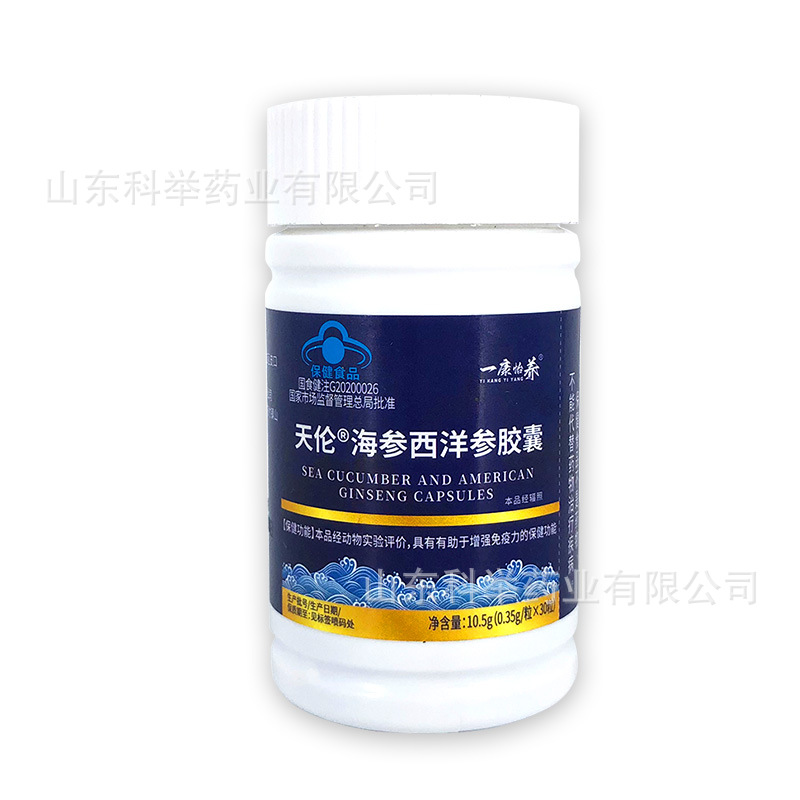 【產品名稱】:天倫海參西洋參膠囊【主要原料】:海參凍干粉、西洋參提取物【保質期】:24(個月)【保健功能】:本品經動物實驗評價,具有有助于增強免疫力的保健功能【規格】:0.35g?!静贿m宜人群】:少年兒童、孕婦、乳母【注意事項】:本品不能代替藥物;適宜人群外的人群不推薦食用本產品【適宜人群】:免疫力低下者【食用方法