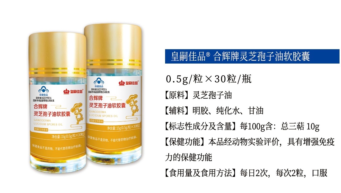【規格】0.5g/粒×30粒/瓶【原料】靈芝孢子油【輔料】明膠、純化水、甘油【標志性成分及含量】每100g含:總三萜10g【保健功能】本品經動物實驗評價,具有增強免疫力的保健功能【食用量及食用方法】每日2次,每次2粒,口服