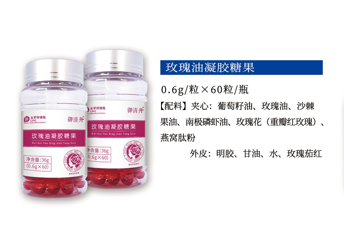 【規格】0.6g/?!?0粒/瓶【配料】 夾心:葡萄籽油、玫瑰油、沙棘果油、南極磷蝦油、玫瑰花(重瓣紅玫瑰)、燕窩肽粉 外皮:明膠、甘油、水、玫瑰茄紅松針油凝膠糖果0.75g/粒×100粒/瓶【配料】 夾心:葵花籽油、松針油、鹽膚木果油、水飛薊籽油 外皮:明膠、甘油、水